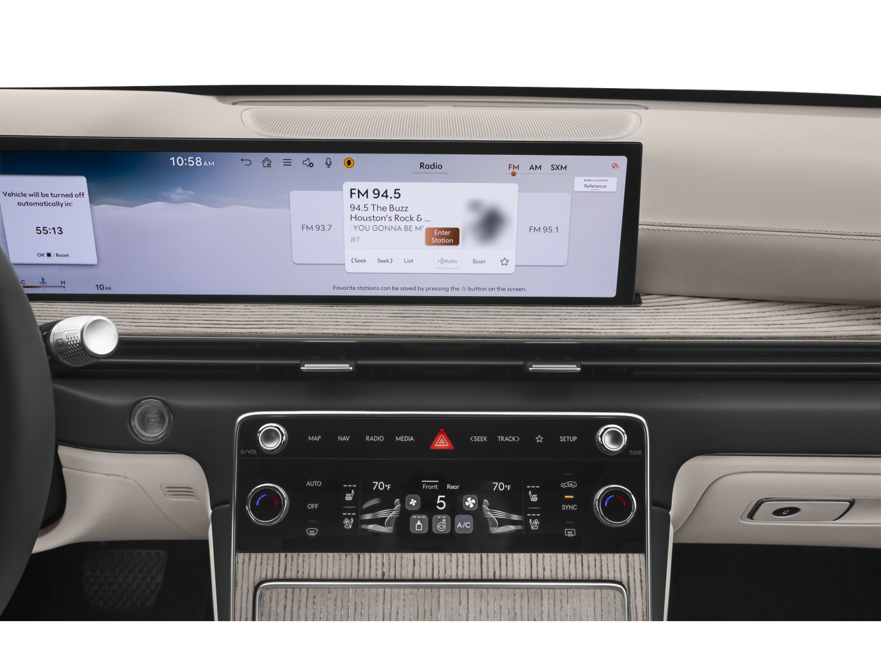- Radio: AM/FM/HD Bang & Olufsen Sound System -inc: 1400 watts, 18 speakers, 14 channel amplifier, 27" integrated OLED instrument cluster and navigation system, SiriusXM Radio w/90-day subscription (not available in AK or HI), cloud connected platform (cloud profiles, connected routing, dynamic voice recognition, OTA updates), wireless Apple CarPlay, wireless Android Auto, Bluetooth® hands-free phone system w/audio streaming, wireless phone charger, Wi-Fi hotspot, steering wheel controls, USB and Genesis Connected Services