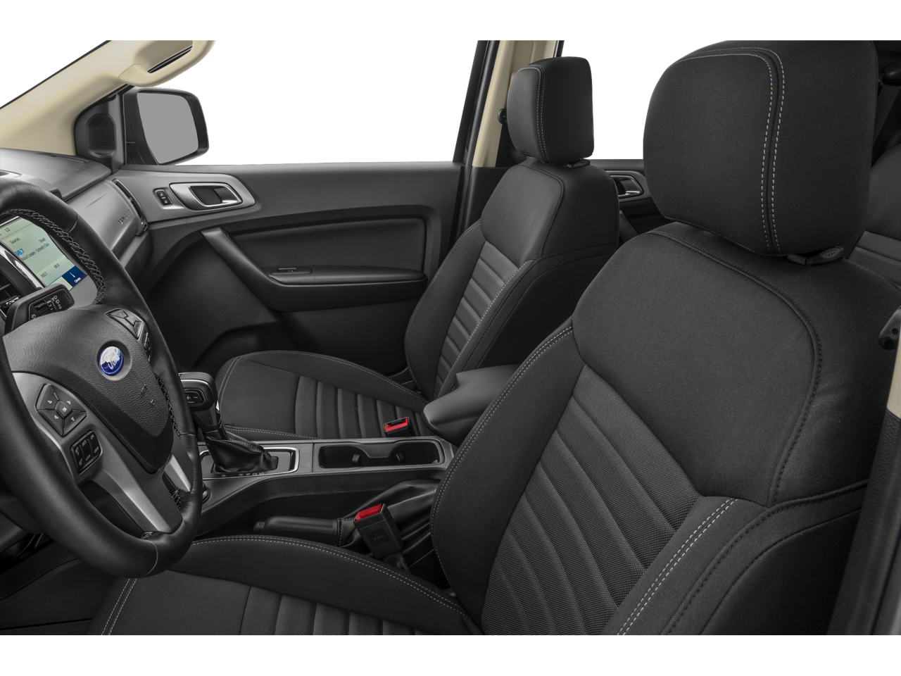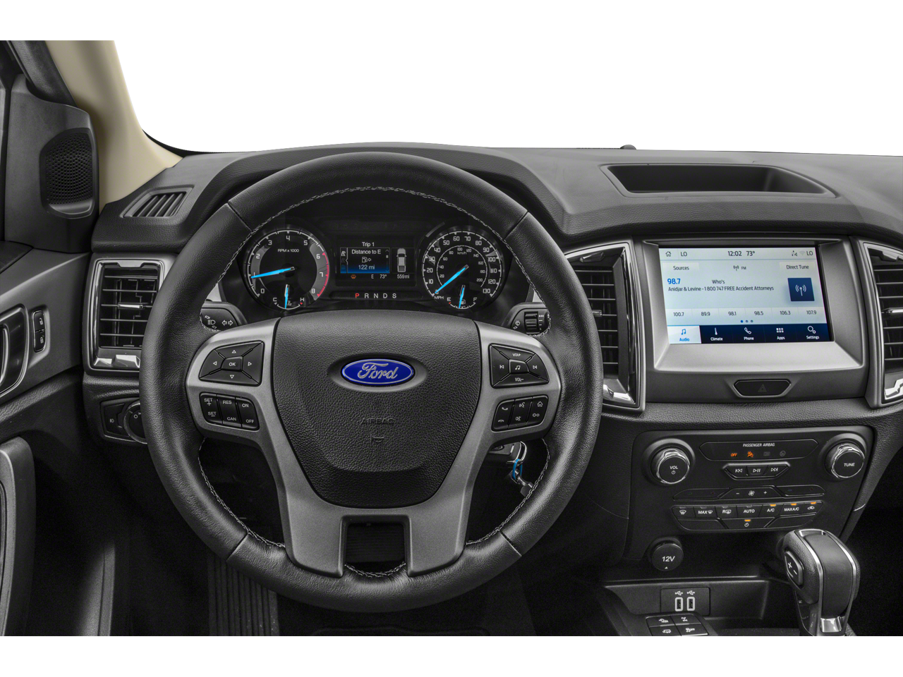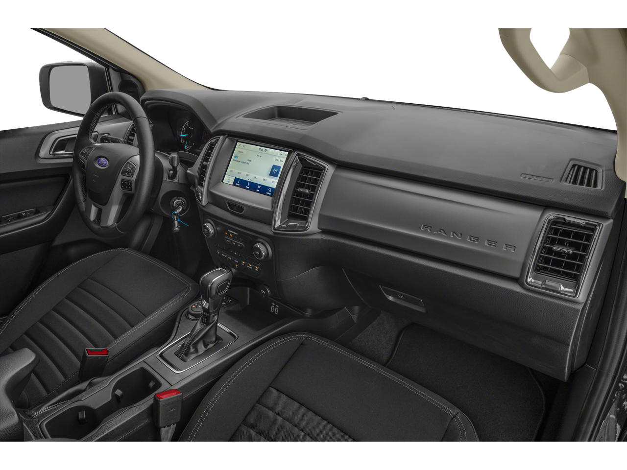Inside, the Ranger XLT offers a premium cabin experience with features like a leather-wrapped steering wheel, auto-dimming rearview mirror, and a 110V power outlet. The SYNC 3 infotainment system with Apple CarPlay and Android Auto integration keeps you connected and entertained on the go.